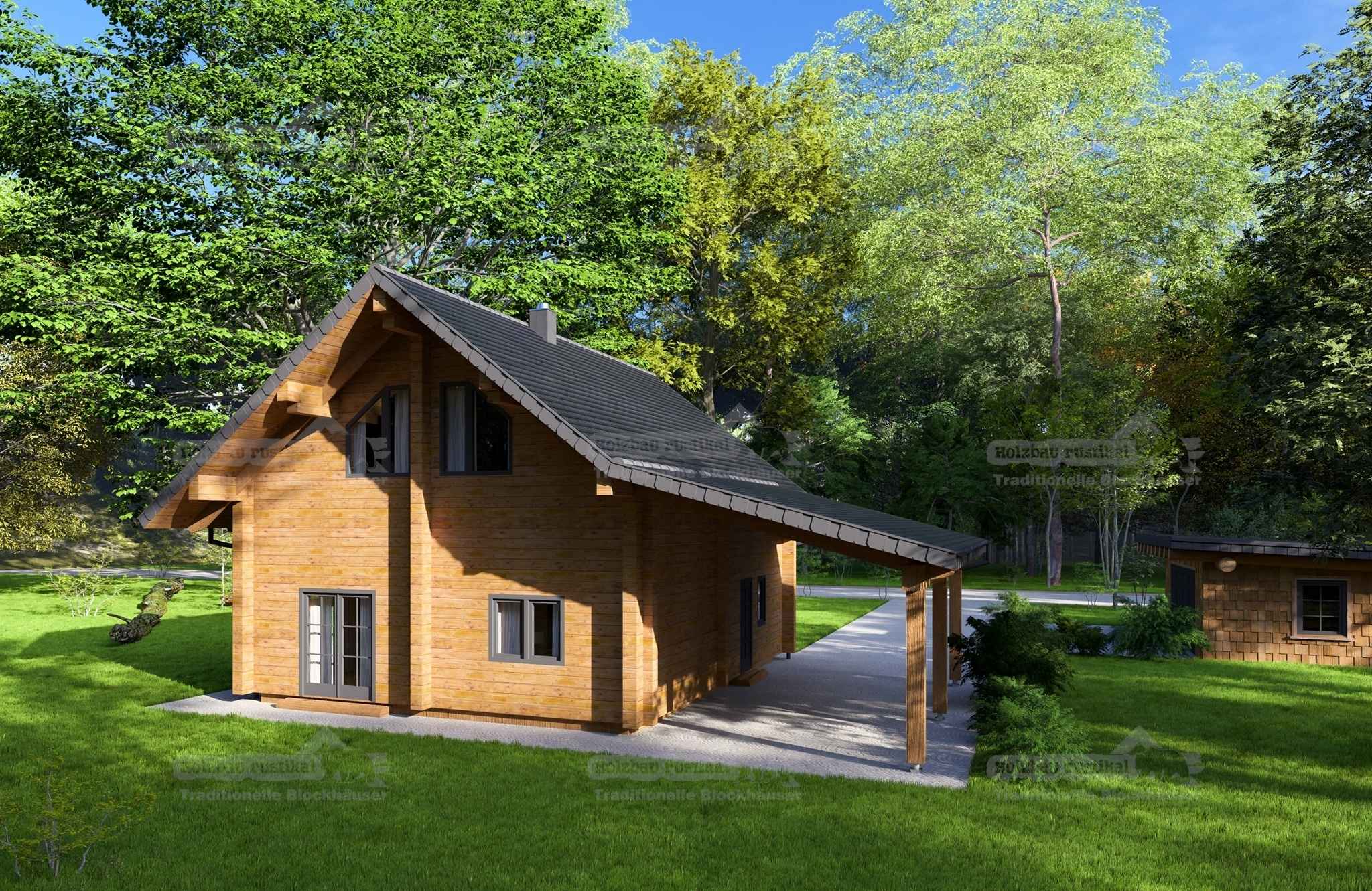 Das Blockbohlenhaus „Altenburg“ verbindet auf einzigartige Weise den traditionellen Charme von Blockhäusern mit modernen Wohnanforderungen. Dank der einzigartigen Giebelfenster mit gebrochener Schräge flutet Tageslicht das Dachgeschoss, sorgt für eine helle, freundliche Atmosphäre und bietet einen fantastischen Blick auf die umgebende Landschaft. Die harmonische Verbindung von traditionellen und modernen Gestaltungselementen verleiht dem Blockbohlenhaus „Altenburg“ seinen unverwechselbaren Charakter. Im Erdgeschoss finden Sie einen offenen Wohn- und Essbereich, eine Küche, einen Hauswirtschaftsraum, eine Speisekammer und ein WC. Das Dachgeschoss beherbergt ein Schlafzimmer, ein Badezimmer, eine Sauna, ein Gästezimmer, ein Gäste-WC und eine kleine Abstellkammer, die sich ideal als begehbarer Kleiderschrank eignet. Mit einer gesamten Wohnfläche von etwa 130 m² bietet das Blockbohlenhaus „Altenburg“ mehr als genug Raum für ein komfortables und naturverbundenes Wohnen. Trauen Sie sich den Schritt in ein neues Wohngefühl und lassen Sie das Blockhaus „Altenburg“ Ihr neues Zuhause werden.